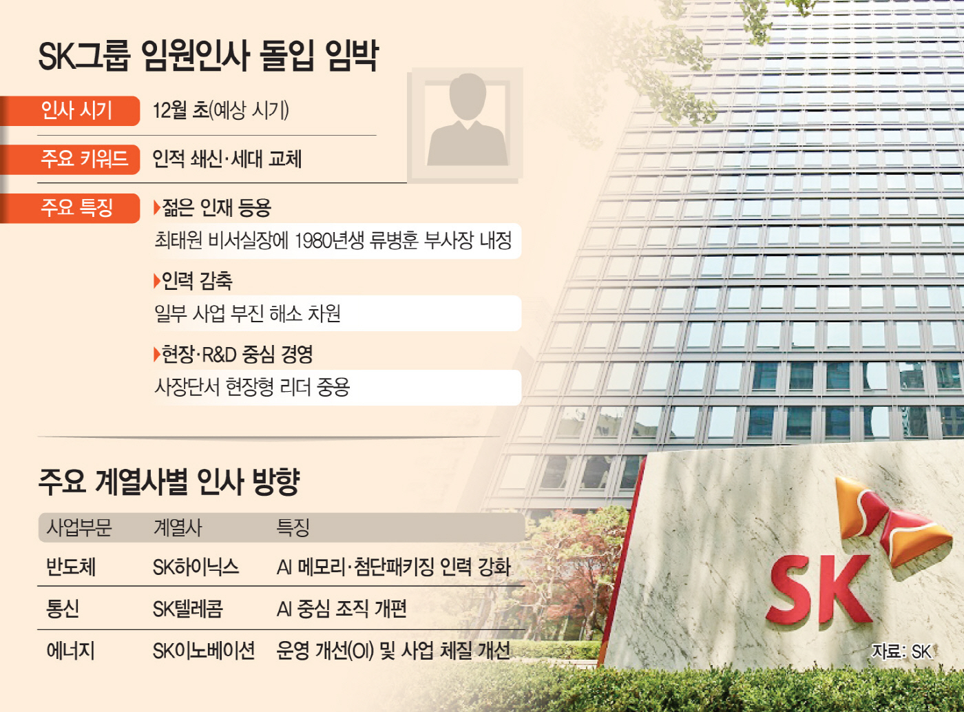 10일 업계에 따르면 SK그룹은 지난달 말 사장단 인사를 일찍 마무리하고, 임원인사 시즌에 돌입했다. 보통 12월 첫째 주에 임원인사 결과가 발표될 예정이지만, 사장단 인사로 발생한 공석은 원포인트로 채워 나가면서 빠르게 임원인사가 단행되고 있다.