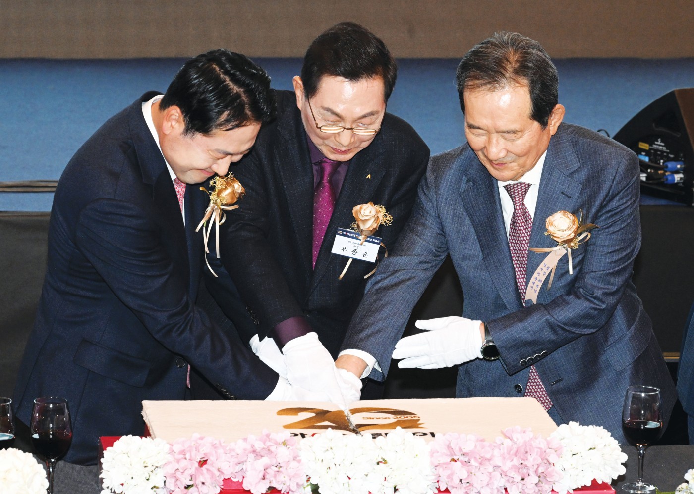 | 10일 서울 중구 소공동 롯데호텔 그랜드볼룸에서 열린 창간 20주년 기념행사에서 우종순 아시아투데이 회장(가운데)과 장동혁 국민의힘 당대표(왼쪽), 정세균 전 국회의장이 케이크 커팅을 하고 있다. /박성일 기자 rnopark99@ |