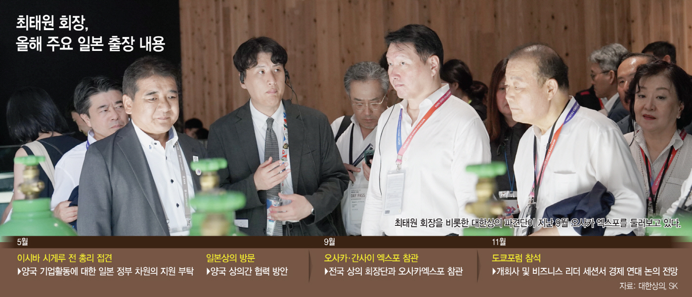 최 회장은 올해 대한상의 회장으로서도 각종 공식적인 일본 출장에서 일본과의 경제 연대를 강력히 주창해 왔다. 지난 5월 이시바 시게루 전 총리와 면담했을 때 최 회장은 "한일 양국이 미국 상호관세 등 글로벌 보호무역주의 확산으로 어려움을 겪는 상황에서 양국 간 경제협력의 확대와 이를 위한 긴밀한 협력이 필요하다"고 강조했으며, 일본상공회의소를 찾아서도 "양국 관계가 날로 중요해지고 있으며 경제적 파트너십이 강화되고 있다"고 협력 의지를 다졌다.