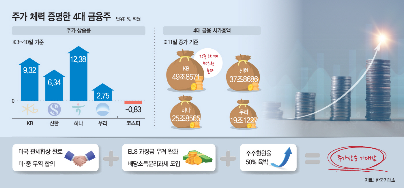 KB금융을 포함한 4대 금융그룹(KB·신한·하나·우리)은 코스피가 조정 국면에 들어갔던 지난주에도 주가가 올랐다. 3일부터 10일까지 코스피는 0.83% 하락했으나, 같은 기간 KB금융은 9.32%, 신한금융 6.34%, 하나금융 12.38%, 우리금융은 2.75% 상승했다.