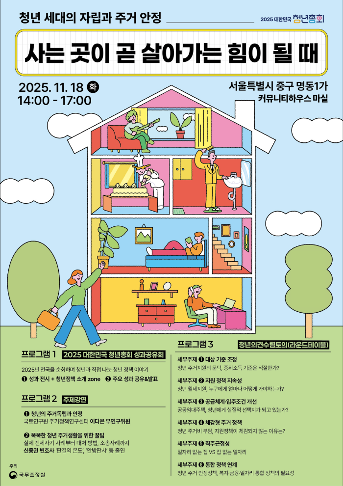 행사에서는 '2025 대한민국 청년총회 성과공유회'도 진행된다. 한 해 동안 전국을 순회하며 열린 청년총회의 주요 결과를 공유하고, 청년정책 논의의 흐름을 되짚는 동시에 제5차 총회 주제인 청년 주거 문제에 대한 실질적 대안을 논의하는 자리다.