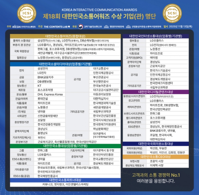 (사)한국인터넷소통협회가 11월 13일 프레스센터에서 '제18회 대한민국소통어워즈 시상식'을 열고 고객과 소통을 잘하는 기업(관)을 발표했다. 시상식은 과학기술정보통신부와 국회 산자위, 행안위 등이 후원한다.