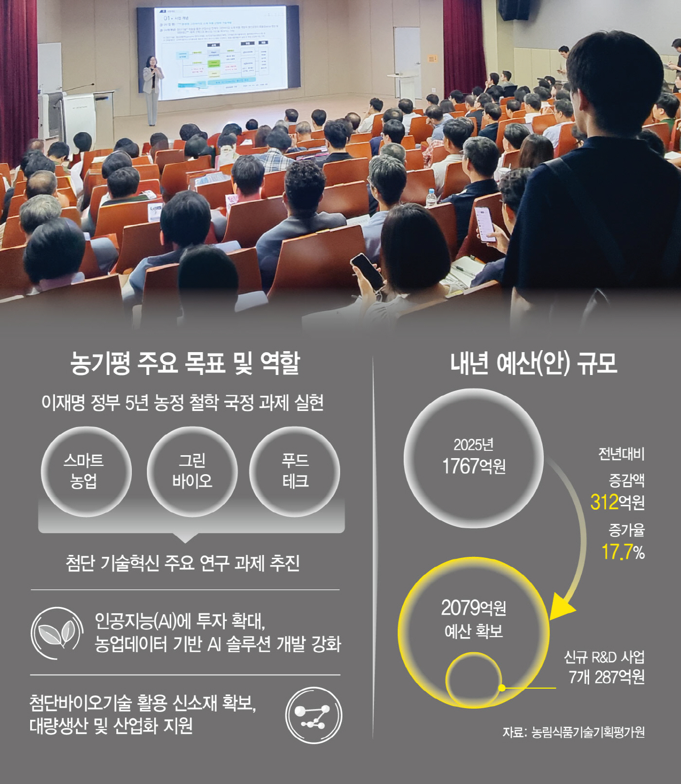 이를 위해 농기평은 연구개발 예산 확보에 총력을 기울였다. 2026년도 신규 R&D 사업 7개(287억원) 포함 등 2079억원의 예산을 확보하는 성과를 올렸다. 이는 올해 대비 312억원(17.7%) 증가한 규모이다.