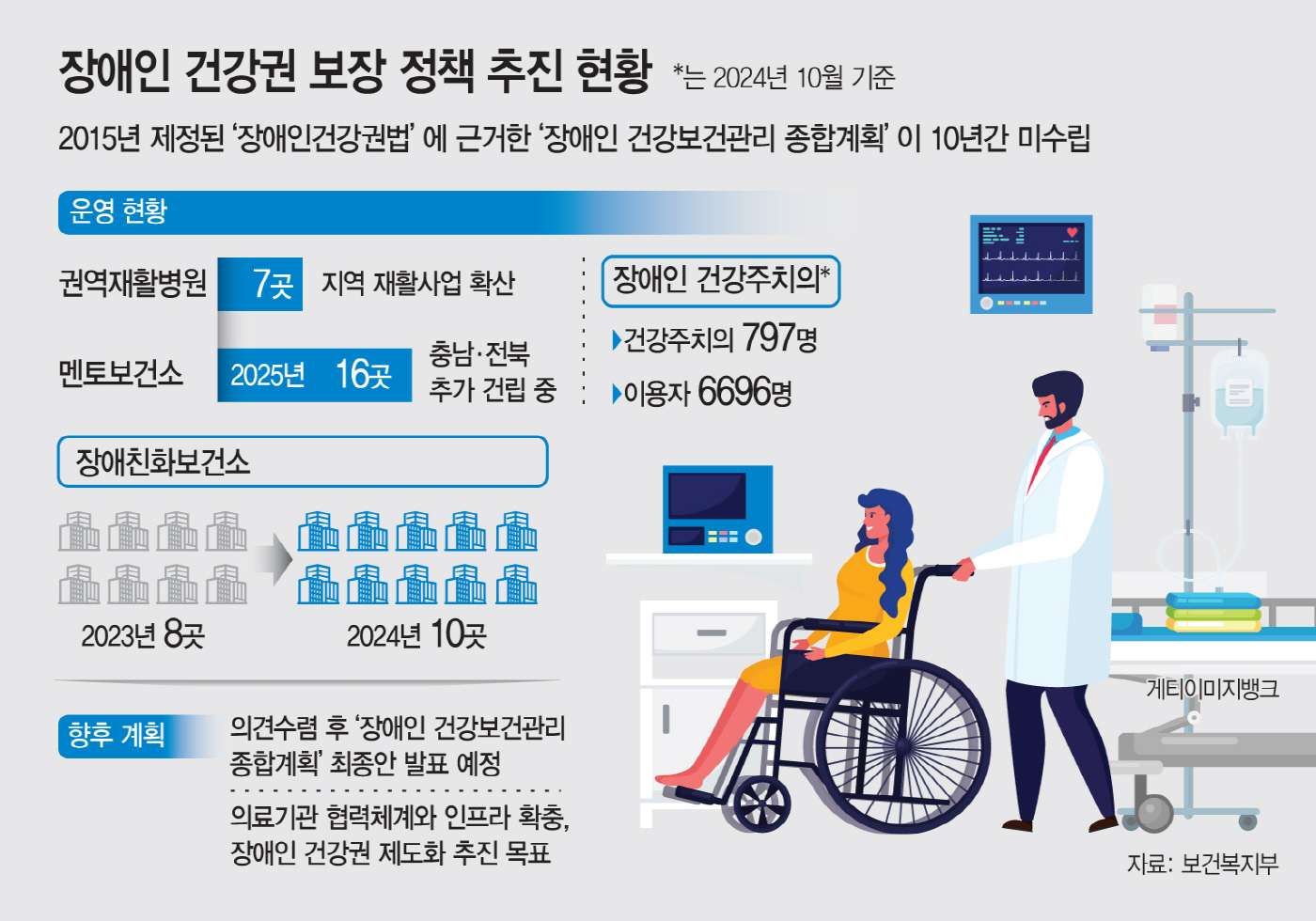 이에 따라 복지부는 장애인보건의료센터와 보건소를 연계한 의료·복지 통합건강보건관리 사업, 장애친화 산부인과, 건강주치의, 권역별 재활병원 등을 중심으로 사업을 추진 중이다. 서울 관악구 등 16개 보건소를 '멘토 보건소'로 지정해 지역사회 중심 재활사업 우수사례를 확산하고 있으며, 장애친화보건소는 2023년 8개소에서 지난해 10개소로 확대됐다. 권역재활병원은 현재 7개소가 운영 중이며, 충청남도와 전북특별자치도에 추가 건립이 진행되고 있다.