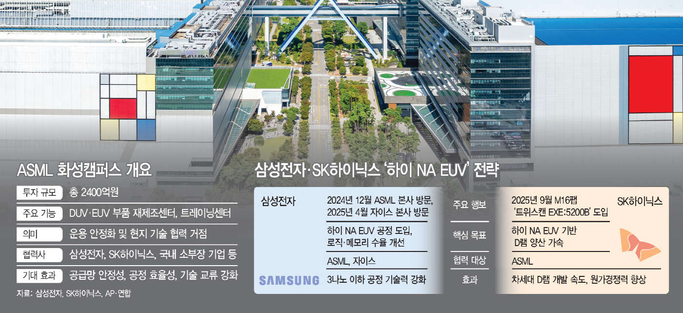 업계는 이번 캠퍼스 준공이 운용 효율성과 기술 지원 강화에 의미가 있다고 봤다. EUV 장비는 워낙 복잡하고 정밀해 공정 중 부품 교체·보정·수리가 빈번히 이뤄지는 만큼, 현지 엔지니어링 거점이 생기면 삼성전자와 SK하이닉스 모두 안정적인 장비 운용 환경을 확보할 수 있다는 얘기다. 업계 관계자는 "EUV는 많이 확보하는 것도 중요하지만 얼마나 정밀하게 다루느냐도 경쟁력의 핵심"이라며 "ASML이 국내에 상시 기술지원 거점을 마련함으로써 엔지니어 교류와 장비 유지보수 효율이 높아질 것"이라고 말했다.