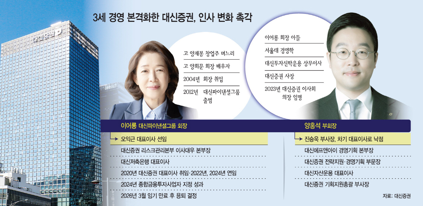 업계 관계자는 "세대교체를 가속화하고 있다는 점은 확실한 '3세 경영' 체제로 바뀌고 있다는 점을 의미한다"며 "다방면에서 대신증권의 인사 시계가 더욱 빨라질 것으로 보인다"고 말했다.