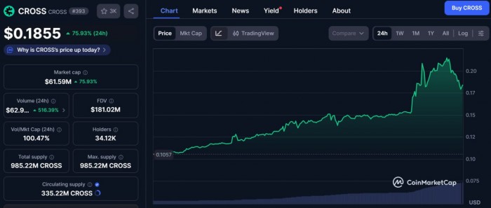 16일 오전 기준 코인마켓캡에 따르면 크로쓰는 전일 대비 약 76% 오르며 강한 상승세를 보이고 있다. 하루 전인 15일에는 글로벌 가상자산 프로젝트 정보 사이트 디앱사이드(DappSide)에서 트렌딩 코인 10위에 이름을 올리며 시장의 주목을 받은 바 있다.
