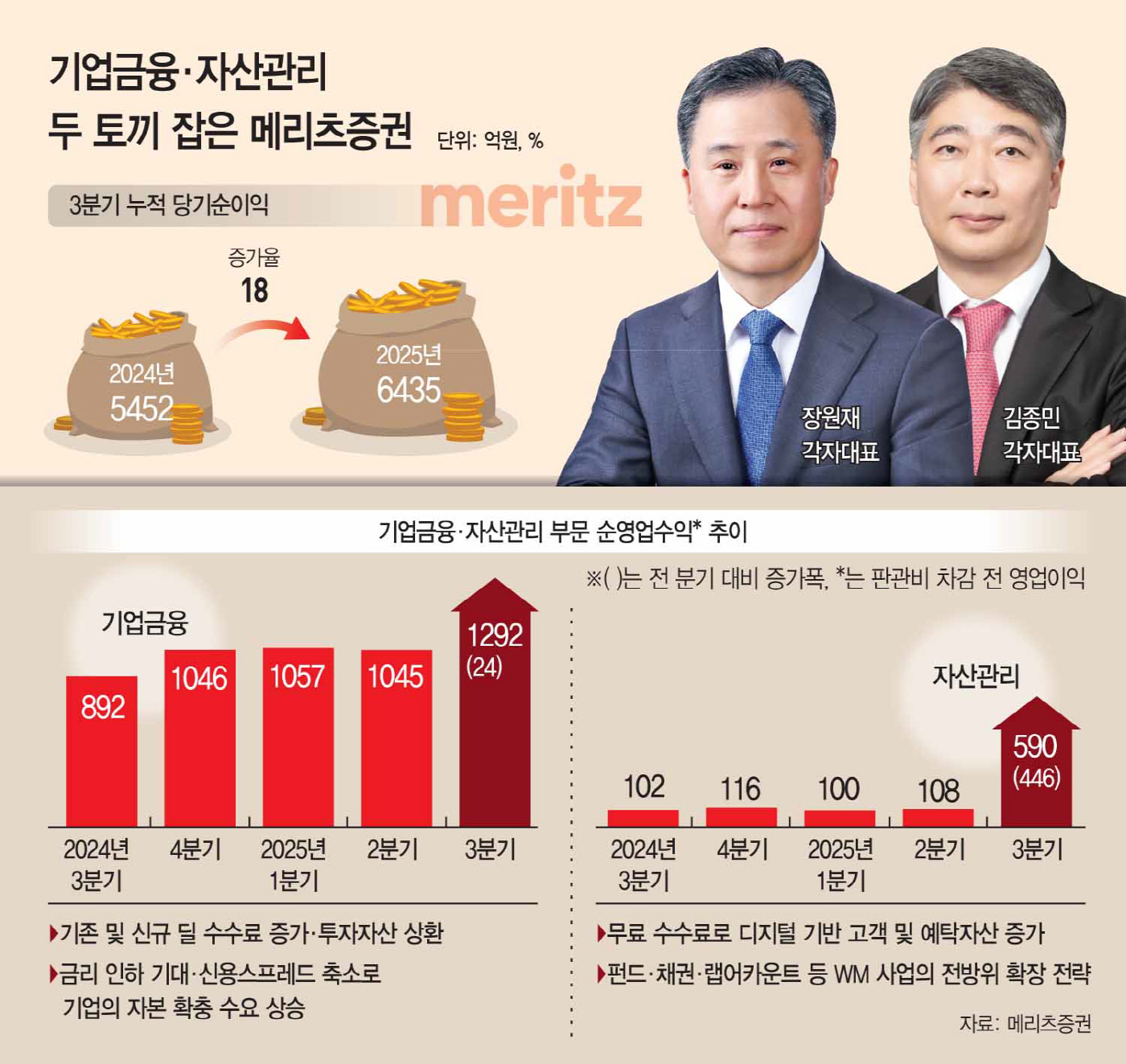 장 대표는 1000억원대의 수수료 비용을 감수하며 리테일 확장 전략을 추진한 끝에 자산관리(WM) 부문의 폭발적 성장을 이뤘다. 김 대표는 부동산 PF(프로젝트 파이낸싱)에서 기업금융으로 투자 포트폴리오를 발빠르게 조정함으로써, 부동산이 침체되는 상황 변화에 능동적으로 대처했다. 이와 같이 두 사람의 리더십과 전문성이 결합하면서 메리츠증권이 그룹의 명실상부한 '주력 사업'으로 도약하는 모습이다.