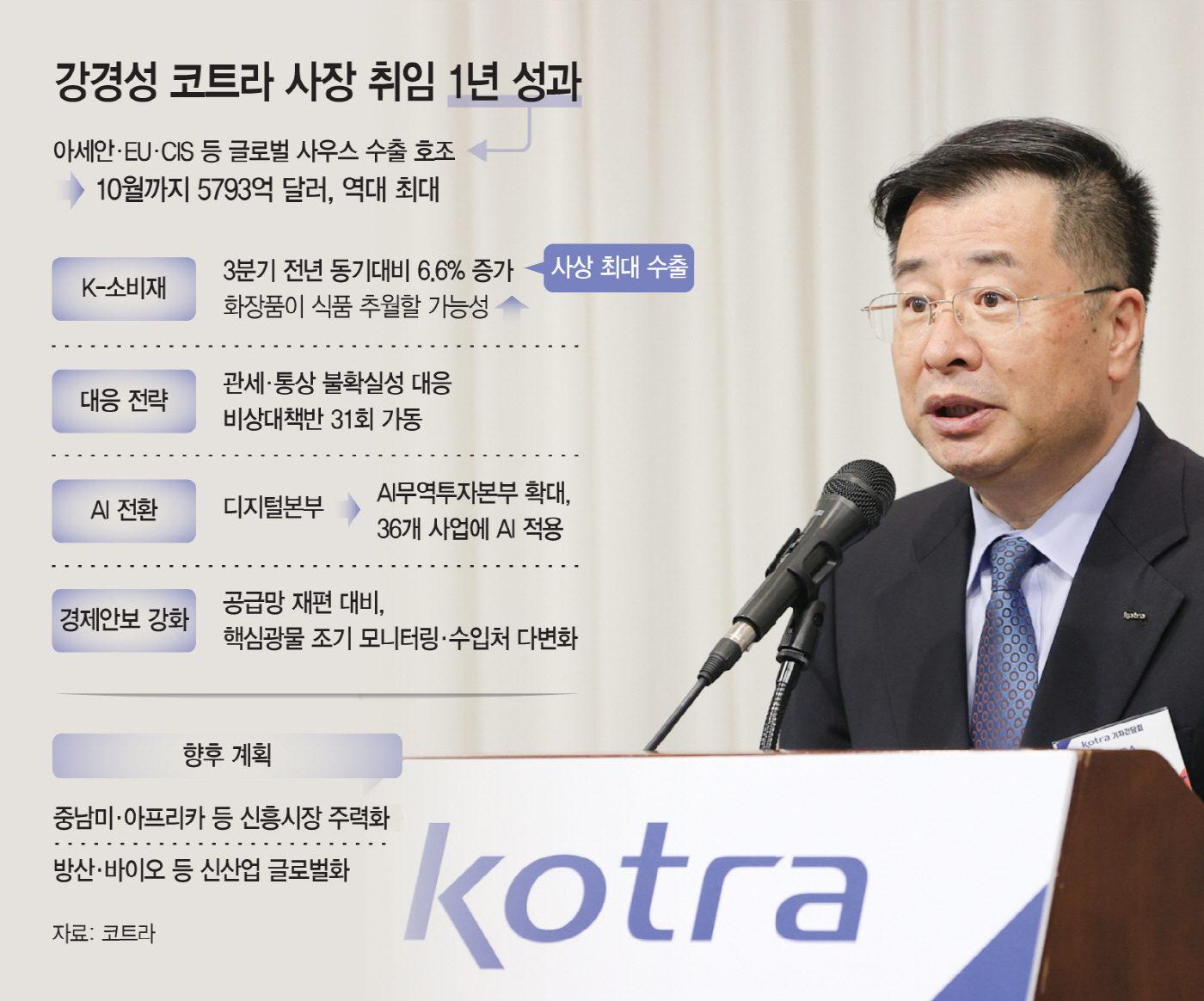 강 사장은 "한국 수출은 품질과 경쟁력을 기반으로 질적으로는 6위이며, 일본과의 수출 격차도 충분히 따라잡을 수 있다"며 "보호무역주의와 기술 패권 경쟁 속에서도 제조업·혁신·한류 소비재라는 세 축으로 반드시 수출 5강을 달성할 것"이라고 밝혔다. 이어 "위기 때 판이 흔들릴수록 기회가 생긴다는 믿음으로 코트라가 글로벌 비즈니스 플랫폼으로서 역할을 다하겠다"고 강조했다.