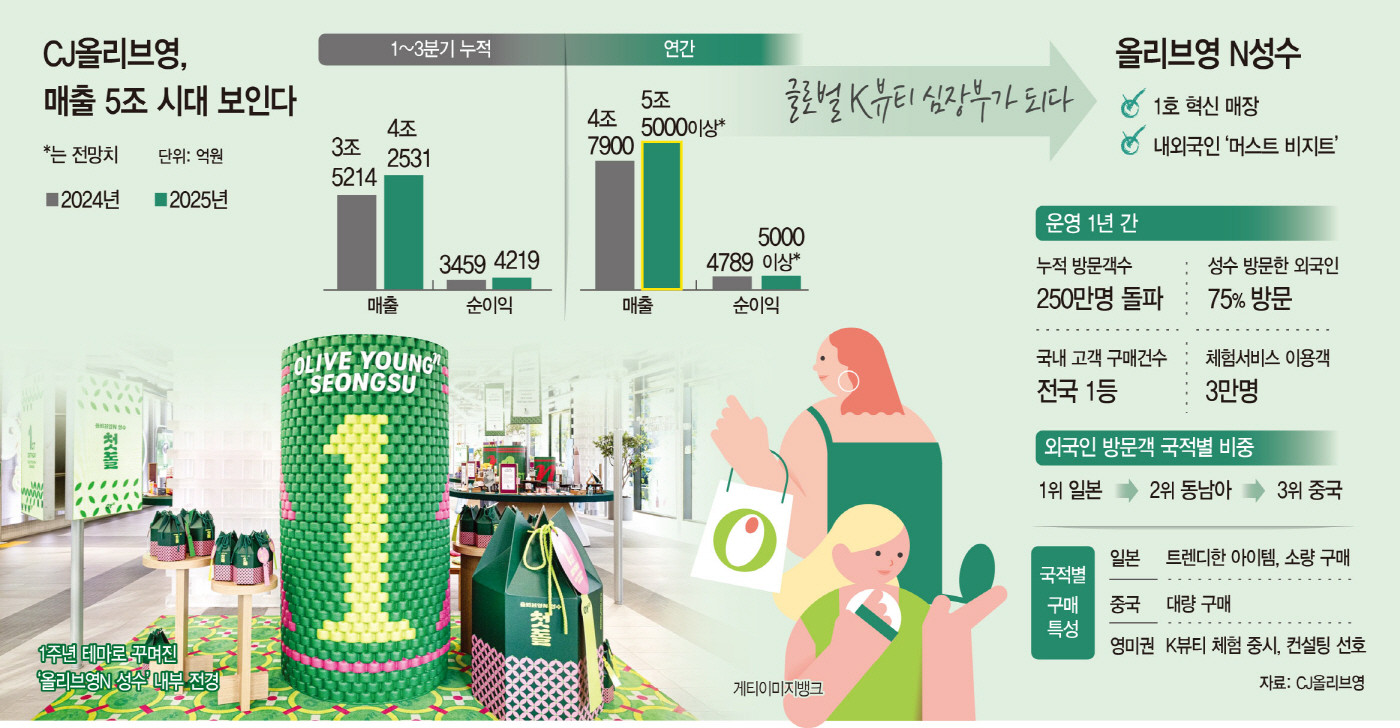올리브영N 성수 오픈 전후 성수 지역 올리브영 전체 매장의 외국인 결제 건수는 지난 1년 새 592% 증가했고, 성수 상권 내 매장 6곳의 외국인 매출 비중은 올리브영N 성수 오픈 전 평균 40%에서 올해 10월 기준 70%까지 상승했다. 올리브영N 성수에서만 도입된 신규 브랜드는 150여 개가 넘으며, 매장 내 뷰티케어 서비스 이용 고객은 누적 3만명을 넘어섰다. 이 중 절반 이상(54%)이 외국인 고객이다.