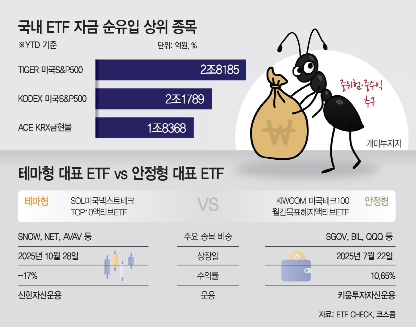 300조원을 앞두고 있는 ETF시장에서 최근 자산운용사들이 출시한 상품이 극과 극을 달리고 있는 점도 시장의 이목을 끌고 있다. 떠오르는 특정 산업군을 기반한 '테마형'과 폭락장 속에서도 하락세를 방어하는 '안정형'이 대표적이다. 테마형은 일찌감치 대부분의 자산운용사들이 양자컴퓨터, AI(인공지능), 조선업 등의 대표 종목들을 묶어 ETF상품을 출시하며 유행을 만들어낸 바 있다. 다만, 코스피 지수가 사상 최고치를 경신함에도 개인들이 순매수한 상위 종목에 'KODEX200 선물인버스'가 있다는 점은 시장 하락에 베팅하는 투자자들도 상당하다는 점이다. 대표적으로 키움투자자산운용의 'KIWOOM 미국테크100월간목표헤지액티브ETF'는 안정형 추구 상품으로, 신한자산운용의 'SOL미국넥스트테크TOP10액티브ETF'가 테마형 상품으로 손꼽히고 있다.