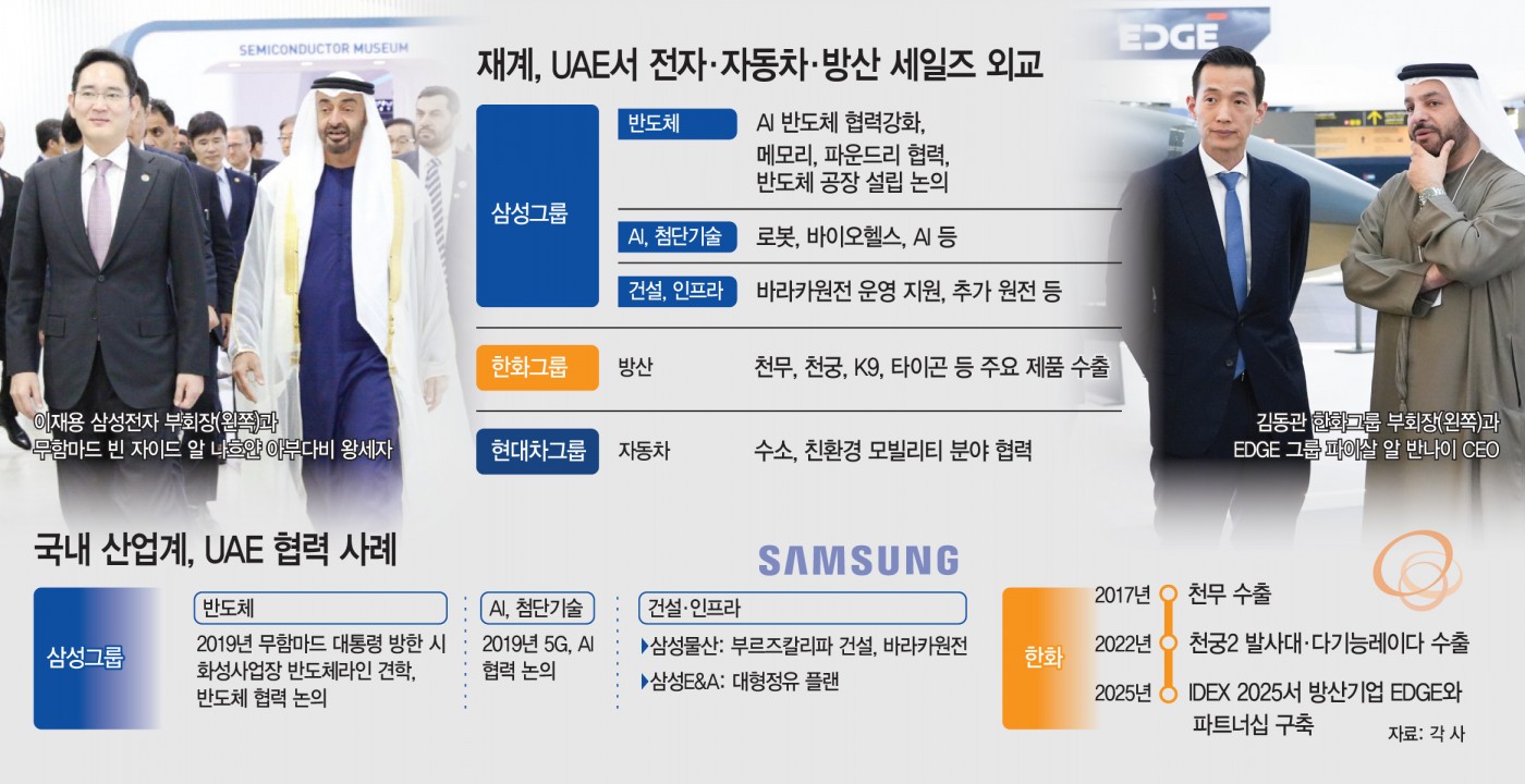 UAE는 2017년 한화의 '천무' 다연장로켓 구매를 시작으로 한국형 무기체계에 대한 신뢰도를 꾸준히 쌓아왔다. 2022년에는 중거리 지대공미사일 '천궁-II' 발사대·레이다 수출이 성사되며 한국산 첨단 무기의 성능 경쟁력을 인정받았다. 현재 한화는 UAE 현지 지사를 통해 군·정부 조달 채널과의 접점을 지속 확대하고 있다.