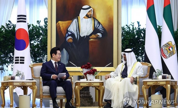 | 아랍에미리트(UAE)를 국빈 방문 중인 이재명 대통령이 18일(현지시간) 아부다비 대통령궁에서 무함마드 빈 자이드 알 나흐얀 UAE 대통령과 한-UAE 확대회담을 하고 있다. /연합 |