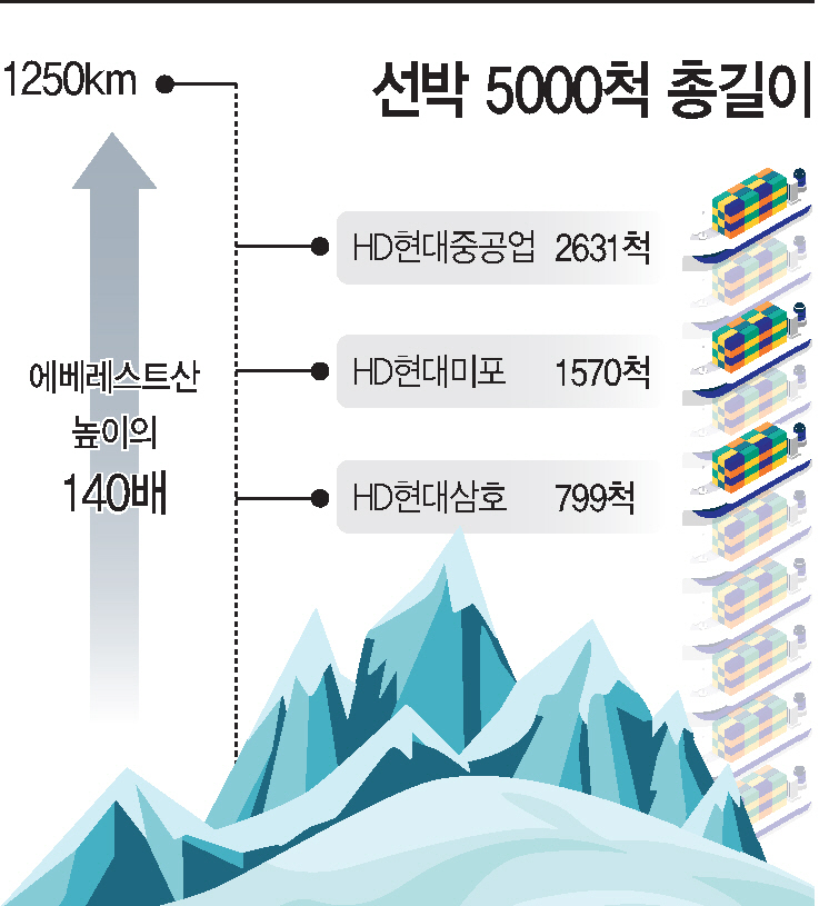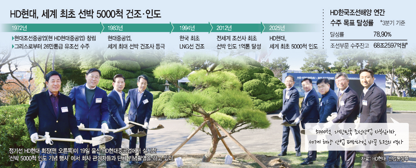 총 5000척 중 HD현대중공업에서 2631척, HD현대미포에서 1570척, HD현대삼호에서 799척을 인도했다. 우리나라보다 오래된 조선 역사를 가진 유럽과 일본에서도 달성하지 못한 기록이다.