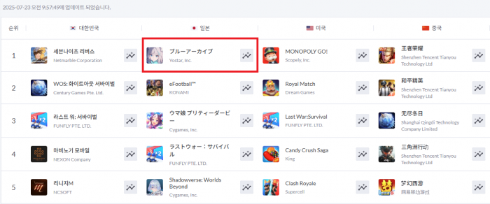 이런 치열한 경쟁 속에서 블루 아카이브가 써 내려간 기록은 이례적이다. 2023년 1월 일본 애플 앱스토어 매출 1위 등극을 기점으로 N주년 페스티벌이나 대형 업데이트 때마다 차트 정상을 탈환하는 저력을 보여주고 있다.