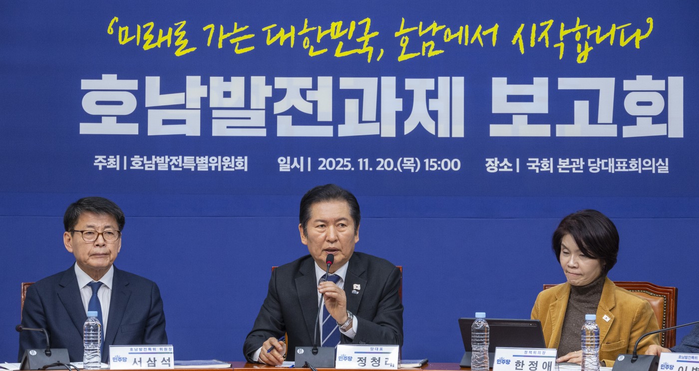 정청래 더불어민주당 대표(가운데)가 20일 국회에서 열린 호남 발전과제 보고회에서 발언하고 있다.  /연합