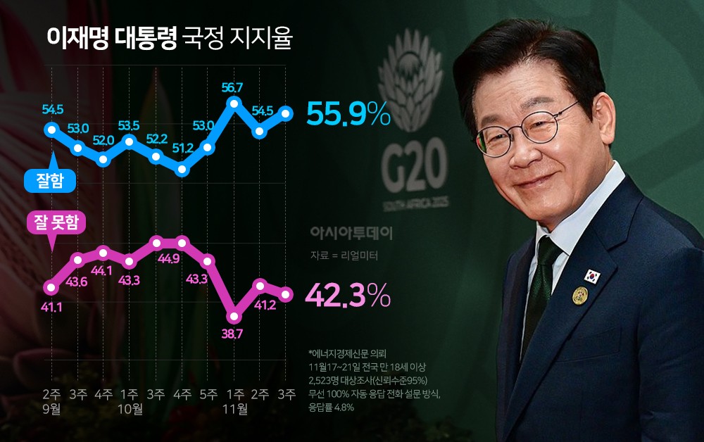 리얼미터가 에너지경제신문 의뢰로 지난 17∼21일 전국 18세 이상 2523명을 대상으로 조사한 결과 이 대통령의 국정 지지율은 55.9%를 기록했다.