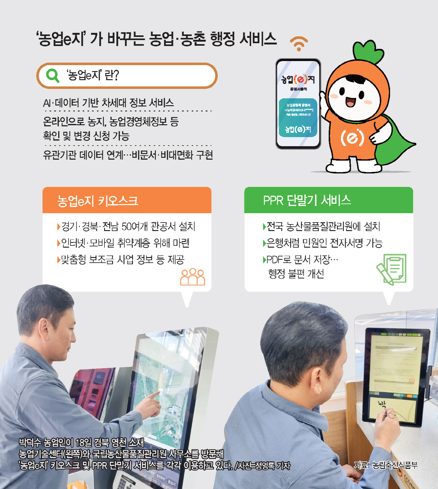 농림축산식품부는 이달부터 경기·경북·전남을 대상으로 50여 개 행정복지센터 등에 농업e지 키오스크를 시범 설치했다. 경기 일부 지역은 마을회관에도 키오스크를 설치한 것으로 전해졌다.
