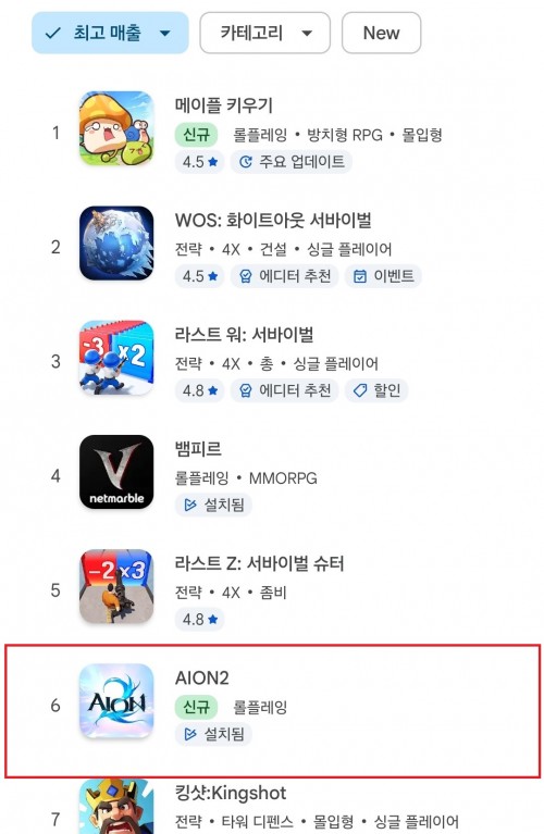 26일 게임업계에 따르면 아이온2는 구글 플레이 매출 순위가 6위로 껑충 뛰어오르면서 월 매출 약 700억원을 기록할 것으로 추산된다.