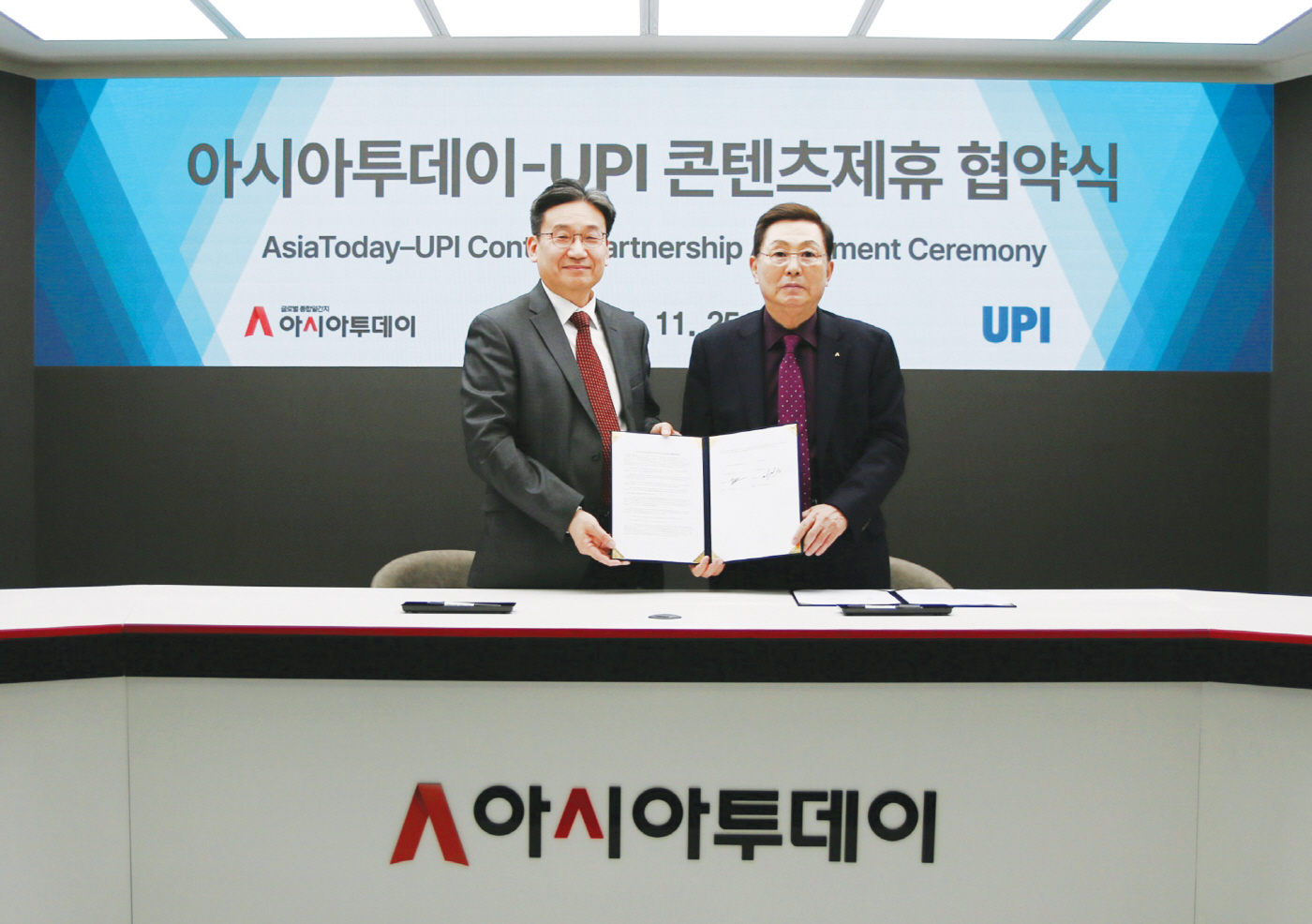 양사는 25일 오후 4시 서울 여의도 아시아투데이 본사에서 '콘텐츠 제휴 협약식'을 열고 텍스트·사진·영상 등 각사가 보유한 주요 콘텐츠를 상호 활용하기로 했다. 이날 협약식에는 아시아투데이에서 우종순 대표이사 회장, 황석순 총괄사장, 이규성 편집국장이 참석했다. UPI에서는 김영준 부회장과 전효준 한국지부 부국장이 자리했다.