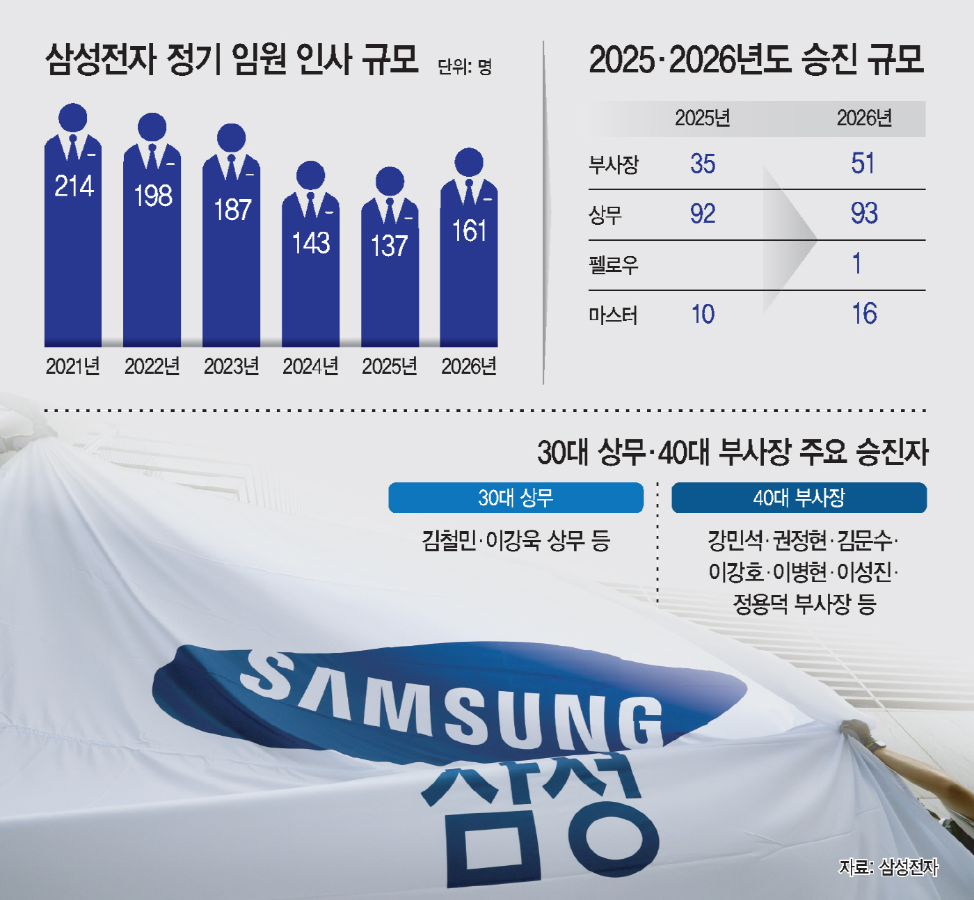 삼성전자는 25일 '2026년도 정기 임원인사'를 통해 부사장 51명, 상무 93명, 펠로우 1명, 마스터 16명 등 총 161명을 승진시켰다. 137명(부사장 35명, 상무 92명, 마스터 10명) 규모였던 지난해보다 승진자 수가 크게 늘었다. 임원 승진 규모가 증가세를 나타낸 것은 5년 만이다. 연도별로 보면 2021년 정기 임원 인사에서 214명이 승진한 이후 2022년 198명, 2023년 187명, 2024년 143명, 2025년 137명으로 줄다가 올해 반등했다.