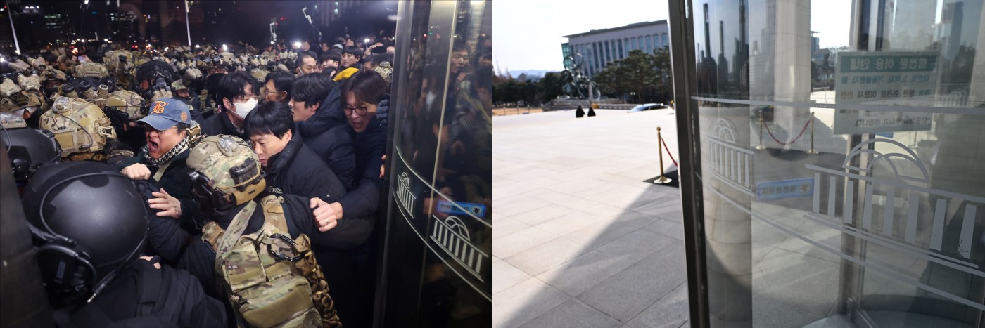 | 지난 12·3 비상계엄 당시 계엄군이 국회 경내로 진입을 시도하는 모습과 1년이 지난 오늘 국회의 모습. /송의주 기자 songuijoo@ |