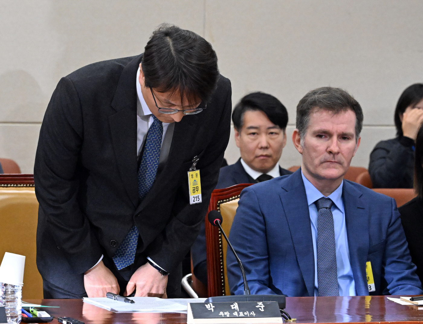 박대준 쿠팡 대표(왼쪽)가 2일 국회 과학기술정보방송통신위원회의 쿠팡 침해사고 관련 현안질의에서 고개 숙여 인사하고 있다. 오른쪽은 브랫 매티스 쿠팡 CISO. /송의주 기자