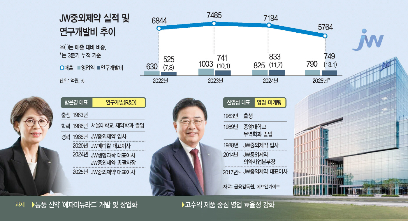 영업·마케팅 부문은 신영섭 대표가 맡아 함 대표와 함께 각자대표 체제를 꾸렸다. 두 사람 모두 JW중외제약 공채 출신이자 1963년생 동갑이라는 점에서, 조직 내에서의 호흡과 협업 시너지에 대한 기대도 나온다.