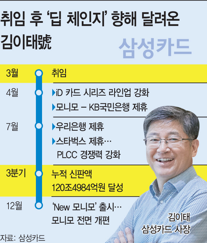 이는 올해 최고경영자(CEO) 자리를 맡은 김이태 사장의 전략이 통했음을 보여준다. 그간 삼성카드 CEO 역할을 맡았던 인물들은 삼성전자나 삼성생명 등 삼성 계열사 출신이었던 것과 달리 김 사장은 행정고시 36회로 기획재정부에서 일했던 관(官) 출신 인사다. 여기에 2016년 삼성전자에 합류하면서 삼성벤처투자 대표이사 자리까지 지낸 '삼성맨'이기도 하다.