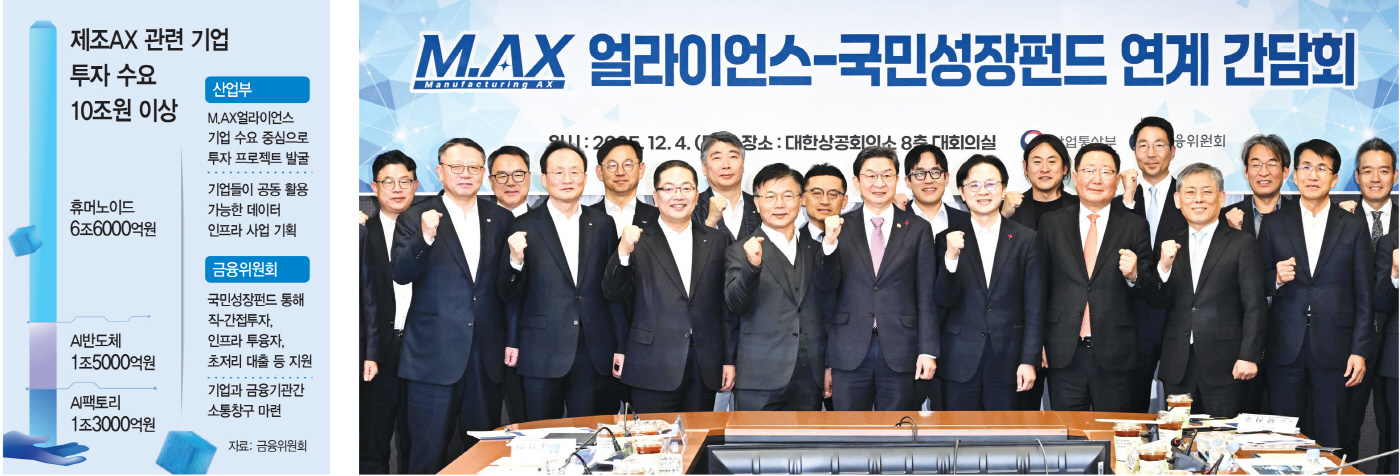 산업부가 M.AX 얼라이언스를 통해 1차 조사한 바에 따르면 제조AX 관련 기업 투자수요는 10조원 이상인 것으로 나타났다. 분야별로 살펴보면 휴머노이드에 6조 6000억원, AI반도체에 1조5000억원, AI팩토리 1조3000억원 등이다. M.AX 얼라이언스 참여기업들은 향후 국민성장펀드와 투자계획, 금융조건 등을 보다 구체적으로 논의할 계획이다. 이에 따라 금융위는 국민성장펀드를 통해 기업수요에 맞춰 직·간접투자, 인프라 투·융자, 초저리 대출 등 다양한 방식을 활용해 첨단전략산업과 관련 생태계를 지원할 방침이다. 올 연말 의사결정 기구가 마련되면 최대한 신속하게 관련 기업들에 투자 집행이 이뤄질 수 있도록 실무 검토를 진행하는 단계다.