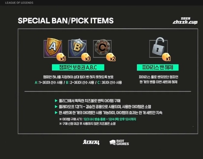 치즈볼을 사용하면 챔피언 하나를 지정해 상대 팀이 밴하지 못하도록 보호하는 '챔피언 보호권'이나 피어리스 밴된 챔피언 하나를 한 세트에 한해 해제하는 '피어리스 밴 해제권' 등을 구매할 수 있다.