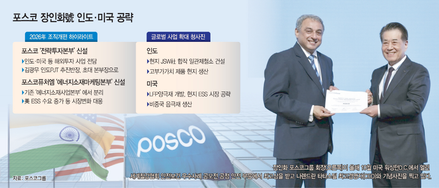 이런 전략은 포스코그룹이 최근 발표한 2026년 인사·조직개편안에 고스란히 드러난다. 포스코는 인도·미국 등 해외 투자 사업을 담당하는 '전략투자본부'를 신설했으며, 본부장 자리는 김광무 포스코홀딩스 인도 프로젝트(PJT) 추진 반장에게 돌아가 인도 사업에 힘을 줬다는 분석이다. 인도PJT는 지난해 말 장인화 회장이 주도한 첫 번째 조직개편에서 현지 투자 가속화를 위해 설립됐다.