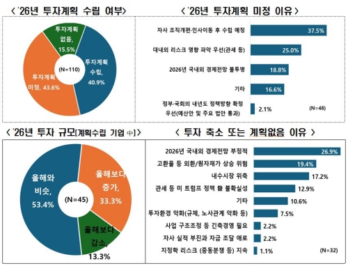 올해보다 투자 규모를 축소할 것이라는 응답은 33.3%, 확대할 것이라는 응답은 13.3%로 조사됐다. 투자 규모를 줄이거나 투자계획이 없는 기업들은 그 이유로 2026년 국내외 경제전망 부정적(26.9%), 고환율과 원자재가 상승 리스크(19.4%) 등을 들었다. 투자 규모를 확대할 계획이라고 응답한 기업들은 미래산업 기회 선점·경쟁력 확보(38.9%)와 노후화된 기존 설비 교체·개선(22.2%) 등을 주요 이유로 꼽았다.