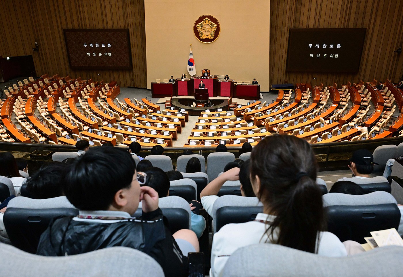 | 박성훈 국민의힘 의원이 지난 9월 29일 국회에서 열린 본회의에서 '국회에서의 증언·감정 등에 관한 법률 일부개정법률안에 대한 수정안'에 대해 무제한 토론을 이어가고 있다. 이날 국회를 관람 온 초등학생들이 관람석에서 본회의를 지켜보고 있다. /이병화 기자 |