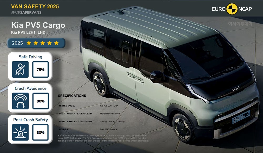9일 기아에 따르면 PV5 카고는 유로 NCAP가 주행 안전성, 충돌 방지, 충돌 후 보호 시스템 등 3개 핵심 항목을 중심으로 실시한 올해 평가에서 전 항목 우수 평가를 받았다. 운전자 모니터링 시스템, 안전벨트 경고, 지능형 속도 제한 장치 등 기본 안전 사양은 물론, 보행자·자전거 이용자까지 정확히 감지하는 전방 충돌방지 보조(FCA) 성능이 높은 점수를 이끌었다. 차로 이탈방지 보조(LKA) 등 주행 보조 기능도 실제 상황에서의 안전성을 강화하는 요소로 평가됐다.