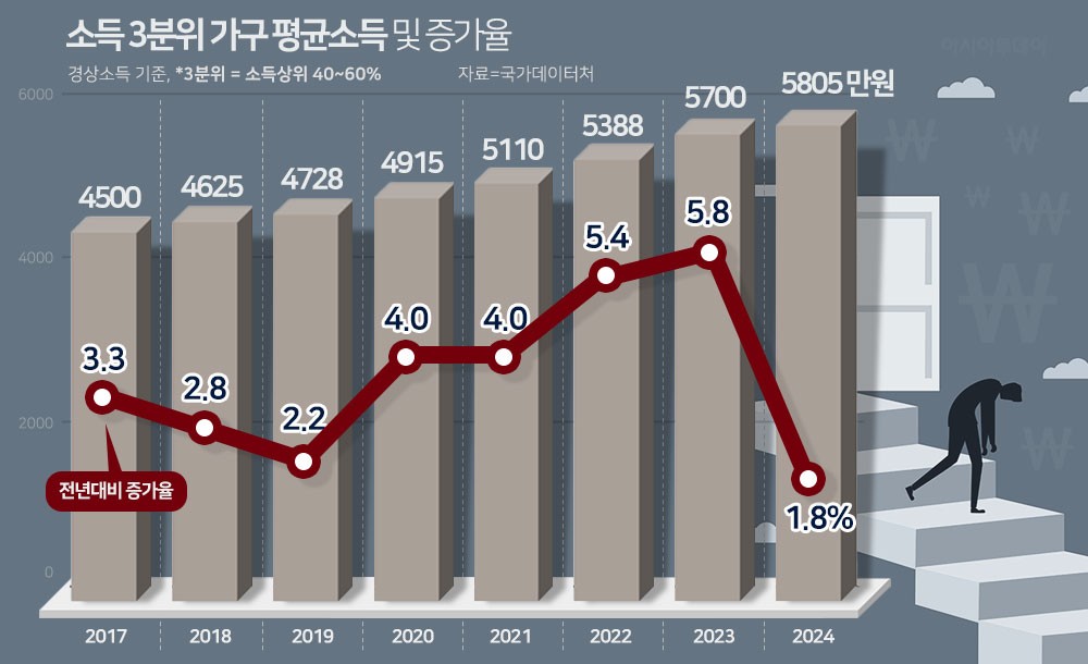 10일 국가데이터처 국가통계포털(KOSIS)에 따르면 지난해 소득 3분위(상위 40~60%) 가구의 평균 소득은 5805만원으로 전년 대비 1.8% 증가하는 데 그쳤다. 2017년 관련 통계 작성 이후 가장 낮다.