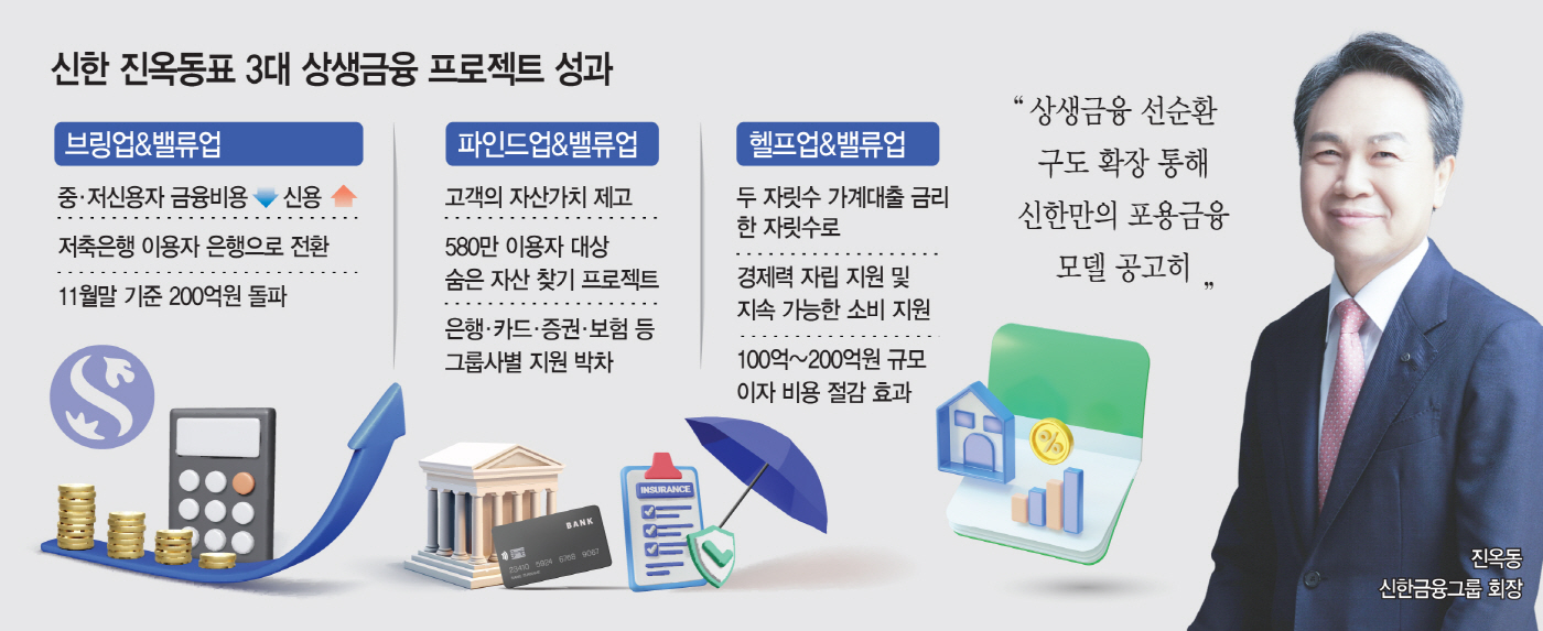 10일 금융권에 따르면 신한금융은 지난해 9월 '브링업&밸류업' 프로젝트를 시작해 '파인드업&밸류업', '헬프업&밸류업'으로 이어지는 진옥동식(式) 포용금융 '3대 상생금융 프로젝트'를 이끌고 있다.