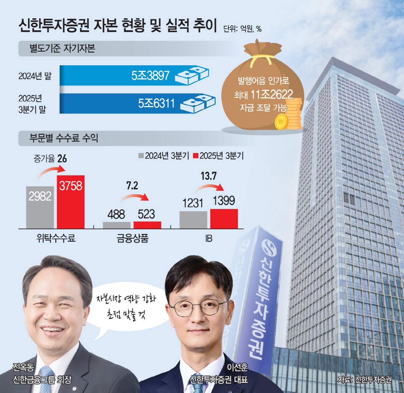 그룹 차원의 전략 변화도 신한투자증권의 성장 잠재력을 키우는 요인으로 꼽힌다. 진옥동 신한금융그룹 회장은 "증권계열의 경쟁력이 그룹 경쟁력과 직결된다"며 자본시장을 핵심 축으로 육성하겠다는 방침을 밝힌 바 있다. 이에 따라 신한투자증권에 대한 그룹 차원의 자본 확충 가능성도 시장의 관심사다. 발행어음 인가로 조달 여력이 확대된 상황에서 유상증자 등 지원이 병행될 경우 자본력 우위가 더 공고해질 수 있기 때문이다.