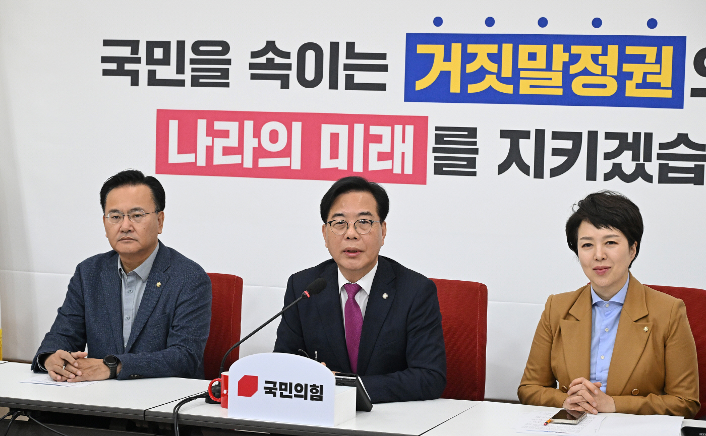 송언석 국민의힘 원내대표가 14일 국회에서 현안 기자간담회를 하고 있다. 왼쪽부터 유상범 원내운영수석부대표, 송언석 원내대표, 김은혜 원내정책수석부대표. /송의주 기자 songuijoo@