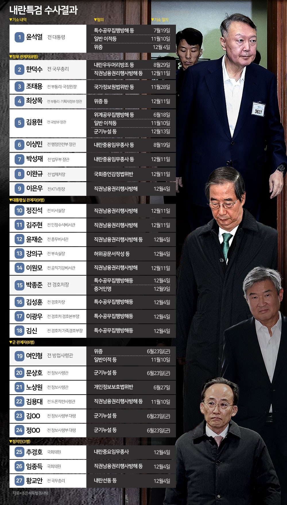 내란 특검팀은 또 정부 관계자 8명, 대통령실 관계자 9명, 군 관계자 6명, 정치인 3명을 차례로 재판에 넘겼다.