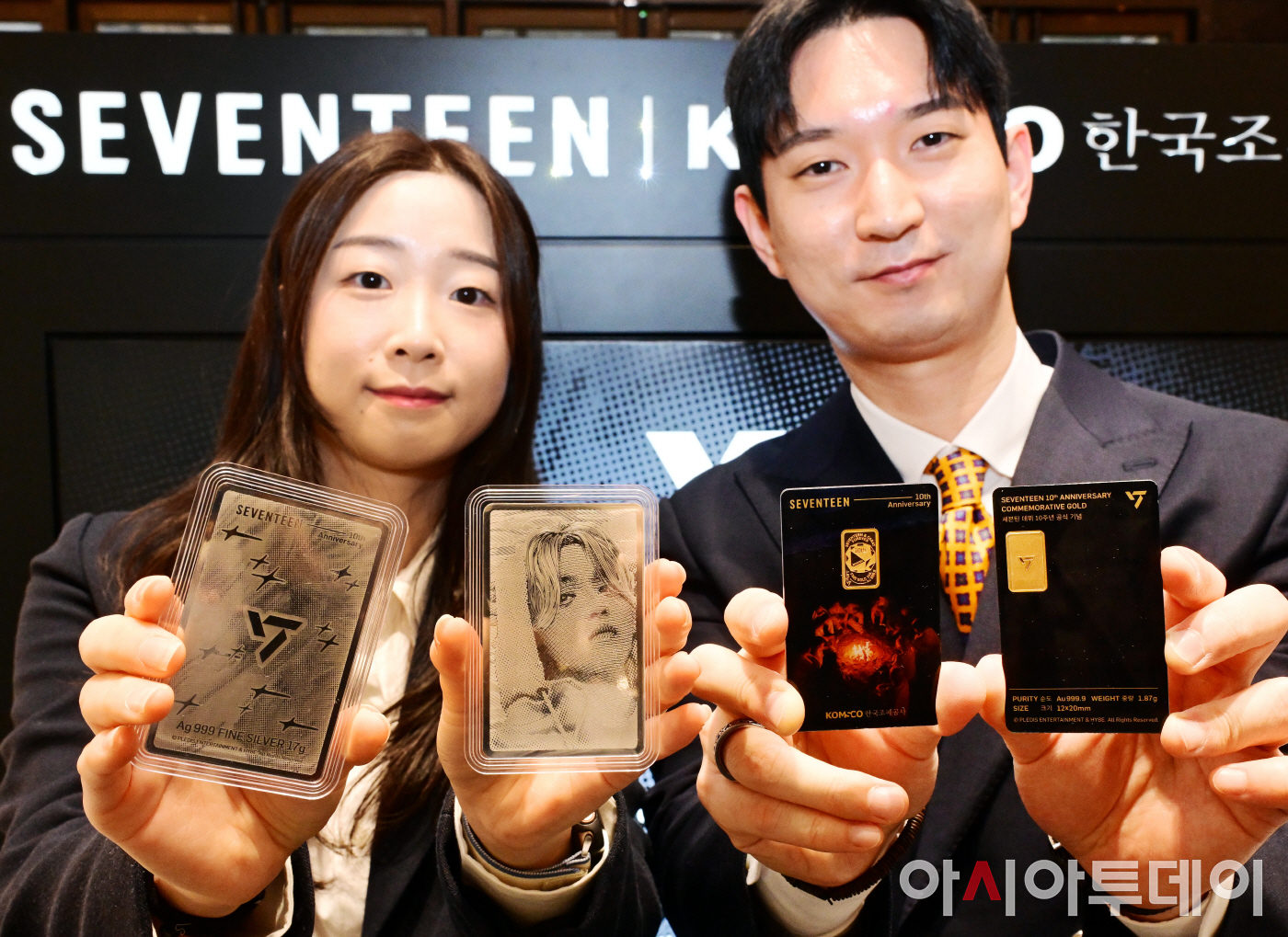 사는 15일 성남시 현대백화점 판교점에서 케이팝 그룹 세븐틴(SEVENTEEN) 데뷔 10주년을 기념한 두 번째 카드형 골드·실버를 공개했다.