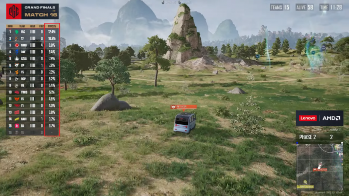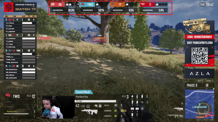 PGC 2025 파이널 경기중 외곽에서 수세에 몰려있던 배고파가 순간적으로 포지션을 변경해 건물을 점거하고 투척무기를 활용해 외곽 팀을 정리했을 때, AI 승률은 순식간에 6%대에서 17% 이상으로 급등했다. 이는 시청자들에게 배고파의 전술적 의도가 성공했음을 데이터로 보여준다.