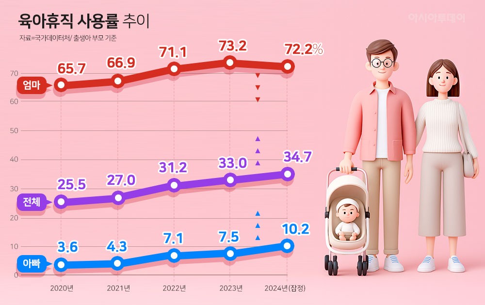 지난해 태어난 아기의 부모 가운데 작년 육아휴직 사용 비율은 34.7%로 전년(33.0%)보다 1.7%포인트(p) 상승했다. 역대 최대 수준이다. 특히 아빠의 육아휴직 사용률이 10.2%로 2.7%p 높아지며 처음 10%를 넘어섰다. 반면 엄마 육아휴직 사용률은 1.0%p 하락한 72.2%로 집계됐다.
