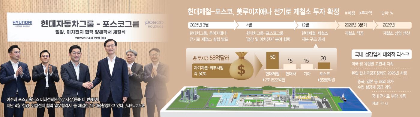 현대제철과 포스코가 총 58억 달러(약 8조5000억원)의 미국 루이지애나주 전기로 제철소 지분 구조를 확정하면서, 양사의 '철강 동맹'이 실행 단계에 들어섰다. 현대제철은 2029년 연산 270만톤의 철강재 생산을 목표로 내년 3분기 착공에 들어갈 예정이다. 글로벌 고율 관세 장벽과 탄소 규제, 중국산 공급 과잉 등 삼중고 속에서 현지 생산 기반의 친환경 강판으로 승부수를 띄우는 것으로 풀이된다.