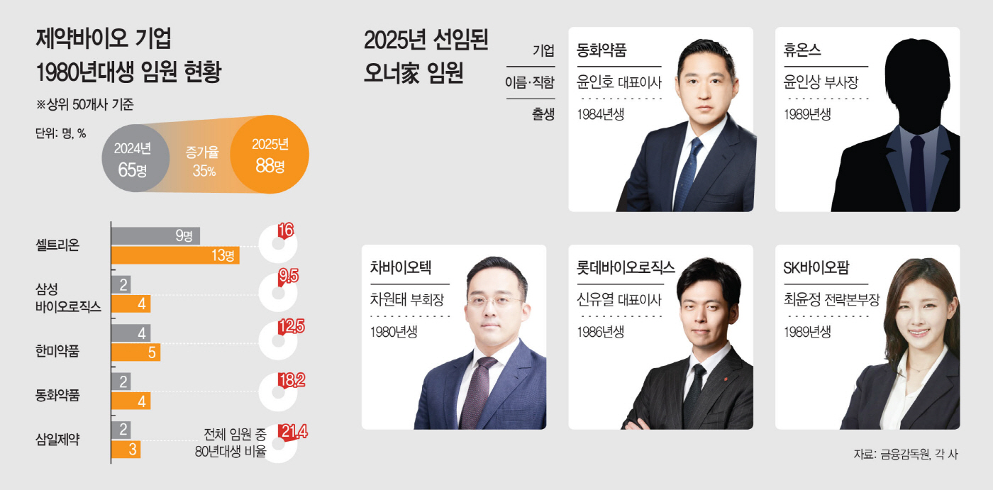 17일 금융감독원에 따르면 주요 제약바이오 기업 50곳의 80년대생 임원 수가 지난해 65명에서 올해 88명으로 약 35% 증가했다. 오너 일가 임원 6명을 포함해 총 23명의 80년대생이 새롭게 임원 자리에 올랐다. 기존 1960~1970년대생 중심이었던 임원진 사이에 80년대생이 본격적으로 자리를 잡는 분위기다.