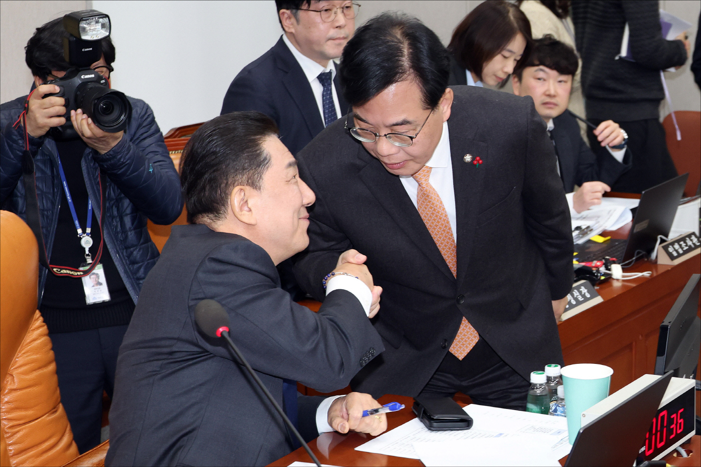 | | 국회 운영위원회 위원장인 김병기 더불어민주당 원내대표(왼쪽)가 18일 국회에서 열린 운영위원회 전체회의에서 송언석 국민의힘 원내대표와 인사를 나누고 있다. /송의주 기자 songuijoo@ |