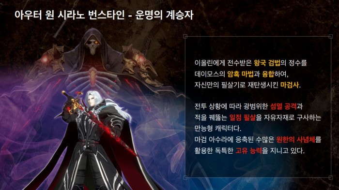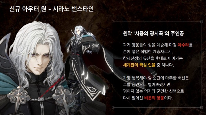 흑태자와 하이델룬의 뒤를 잇는 신규 등급 '아우터 원'으로 등장하는 '시라노 번스타인'은 이번 업데이트의 주인공이다. '시라노'는 이올린의 왕궁 검법과 데이모스의 암흑 마법을 융합한 마검사로 광범위 섬멸과 일점 필살을 모두 갖춘 만능형 캐릭터다.