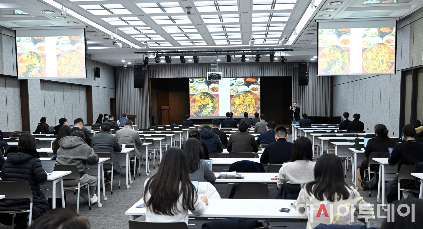 노중훈 여행작가가 <여행과 미식의 즐거움: 풀뿌리 식당 이야기>에 대해 강연하고 있다.