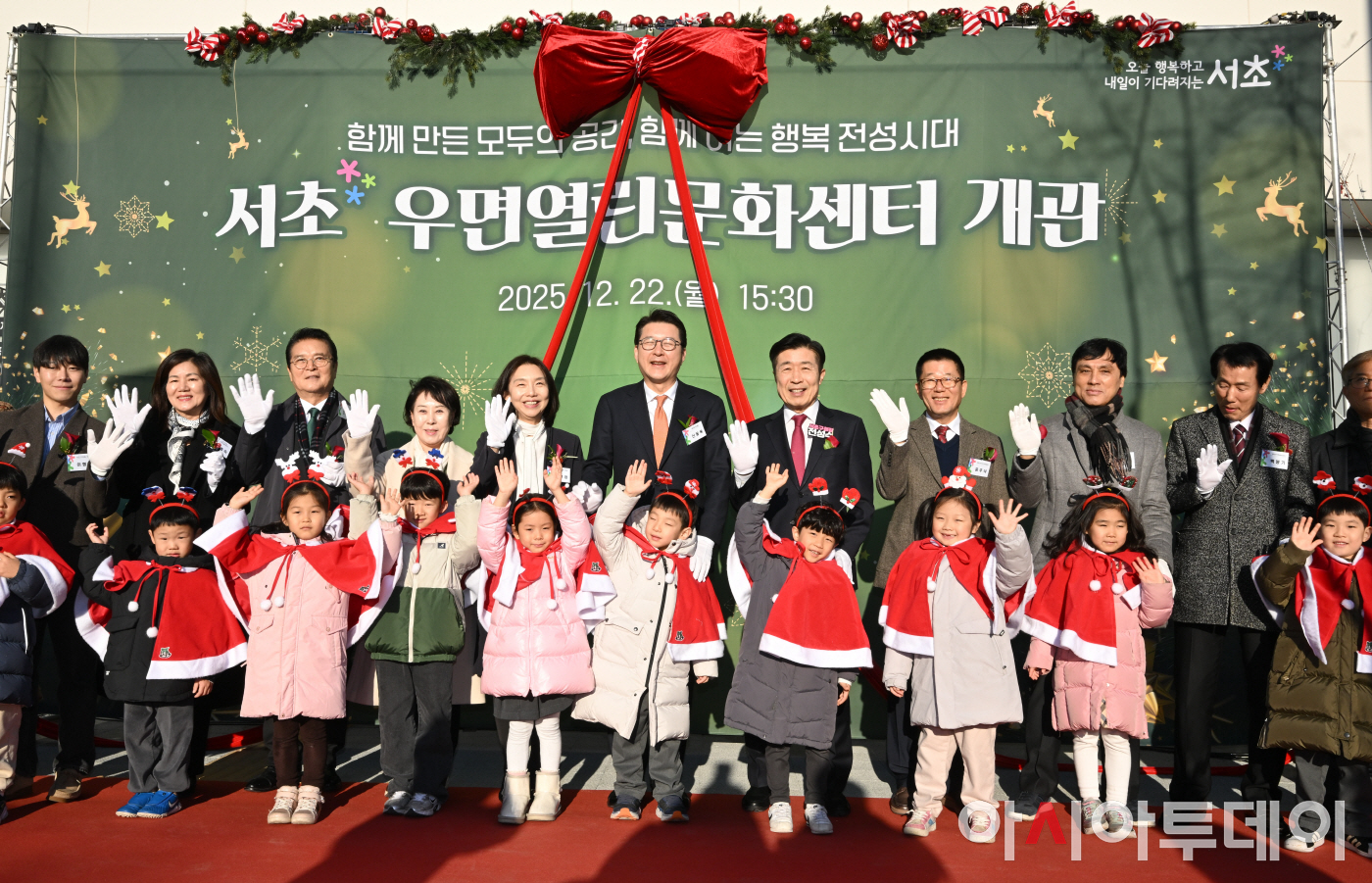 전성수 서초구청장(오른쪽 네 번째)이 22일 서울 서초구 우면동 문화·복지 복합공간 '우면열린문화센터'에서 열린 개관식에서 참석자들과 제막식을 하고 있다. 서초구는 우면·양재 지역의 문화·복지 거점으로서 첫발을 내딛는 우면열린문화센터를 이날 개관했다. 자연과 조화를 이루는 친환경 건축물로 센터 내 서리풀노리학교, 초등키움센터, 우면민원분소, 우면데이케어센터, 우면도서관, 주민자치회관 등 전 세대가 이용할 수 있는 총 6개의 다양한 주민편의시설로 조성했다. /정재훈 기자