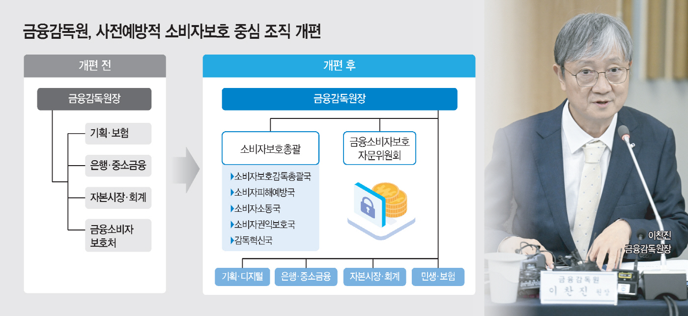 우선 소비자보호 기능은 '소비자보호총괄' 부문으로 개편돼 원장 직속으로 배치된다. 금감원은 기존 '소비자보호' 부문에 감독서비스 전반을 총괄하는 기능을 부여해 검사·제재, 상품심사, 민원 처리 등 감독 수단을 소비자 보호 관점에서 통합적으로 운용할 방침이다.